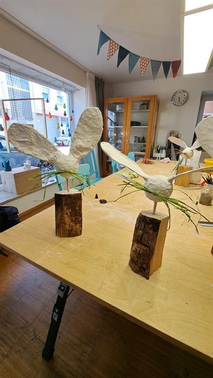 In diesem WerkShop gestalten wir Hasenfiguren als kleine plastische Arbeiten. Aus Styroporkugeln, Draht und Holz wird zunächst eine einfache Grundkonstruktion gebaut. Mit Kreppband und/oder Nylonstrümpfen werden die einzelnen Elemente verbunden und vorbereitet. Anschließend überziehen wir die Formen mit Gips.